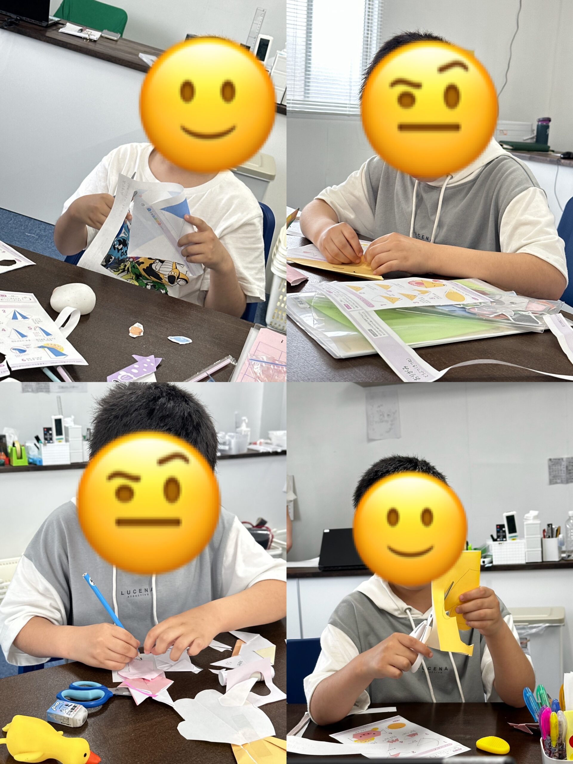 まずは、パソコンで作りたい動物を検索して印刷し、ハサミで丁寧に線に沿って切っていきました。キツネ、タヌキ、犬など、いろいろな動物を選び、折り線に合わせて山折り・谷折りをしながら、真剣な表情で顔の部分を作っていきました!