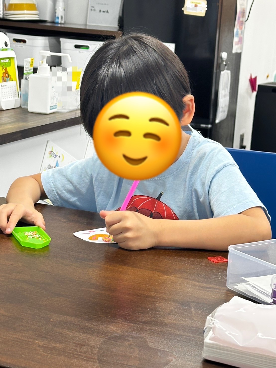 細かいビーズを付属のペンを使って、正確な場所に貼っていく作業は、手先の器用さはもちろん、集中力を育むのにぴったりなんです!