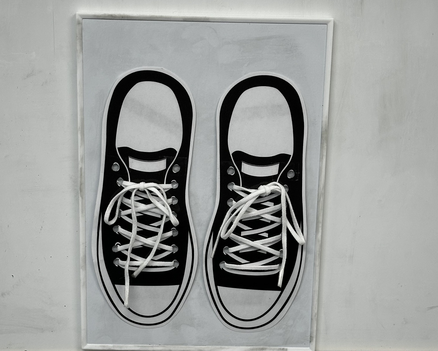 ホワイトボードに、紐を通したスニーカーのイラストを貼り、子どもたちが自由に挑戦できるように設置しておくと、「これ何?」と興味津々な様子で紐を手に取り、指導員に尋ねる姿が見られました。