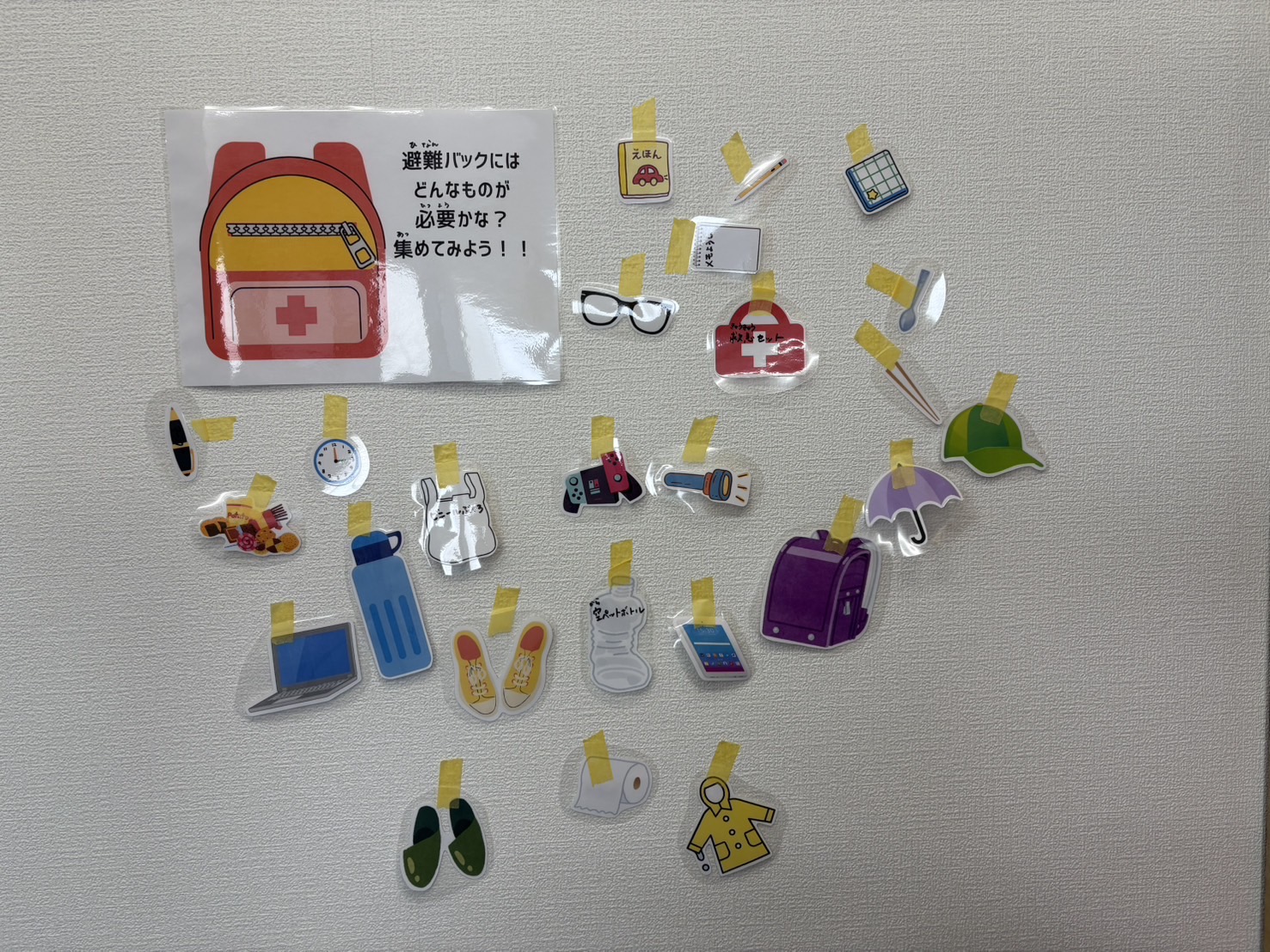 今回の活動では、壁にリュックサックのイラストを貼り、その周りに、空のペットボトル・懐中電灯・ビニール袋・水筒・時計・ハンカチなど、さまざまなアイテムのイラストを用意しました♪