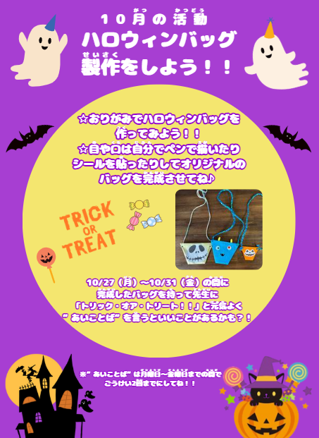 今回は、前回ご紹介したハロウィン制作の1つ、「折り紙で作るハロウィンバッグ制作」の様子をピックアップしてご紹介します!