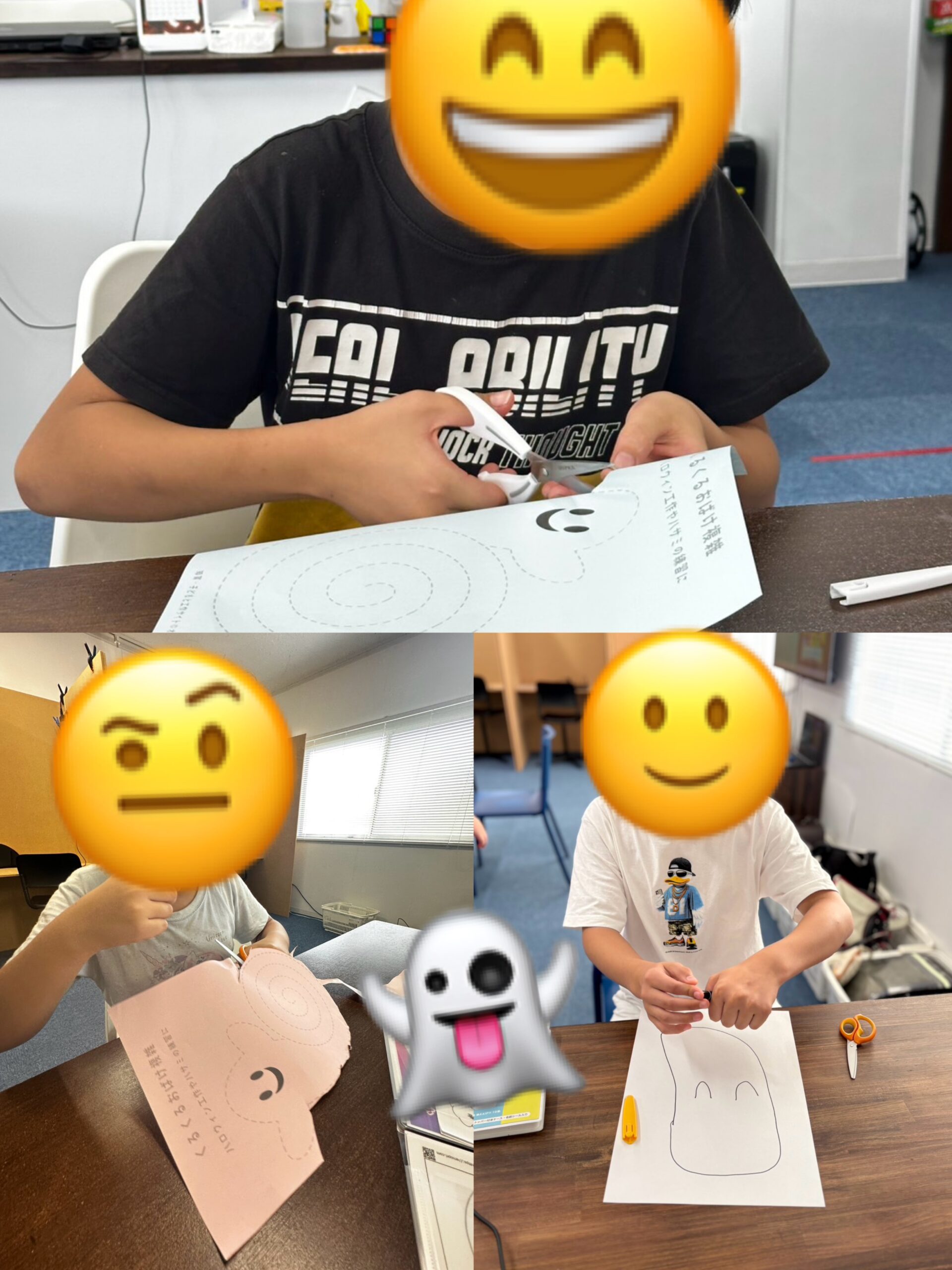 制作が始まると、はさみで渦巻き状の点線に沿って切るのが少し難しく、真剣な表情で集中して取り組むお子さんもいれば、器用にスイスイと切り進めるお子さんもいて、それぞれの個性が光っていました☆