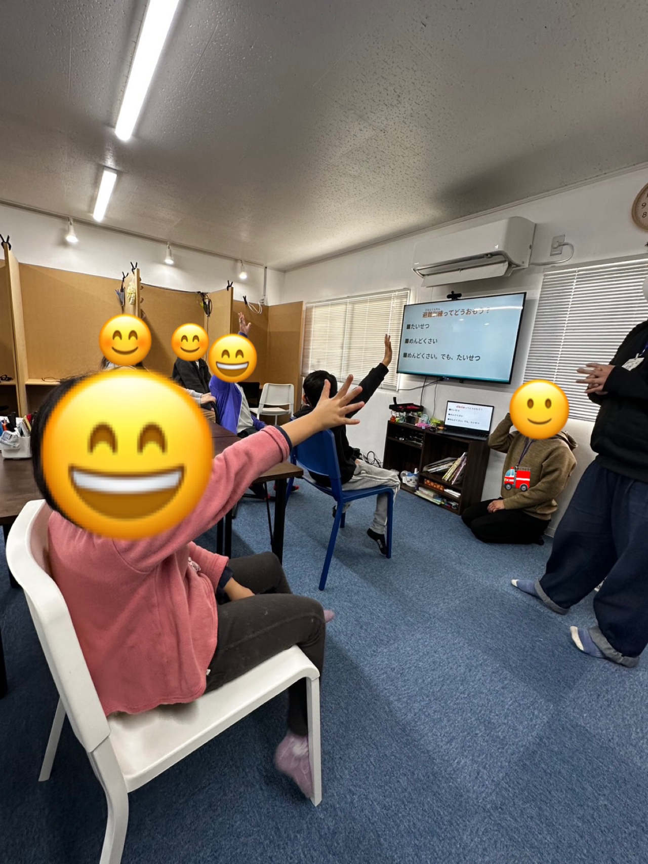 お話しの途中、姿勢が崩れてしまうお子さんもいましたが、「お話を聞く時の姿勢はどうだったかな?」と確認すると、すぐに背筋を伸ばして聞く姿勢に戻ることができていました!!