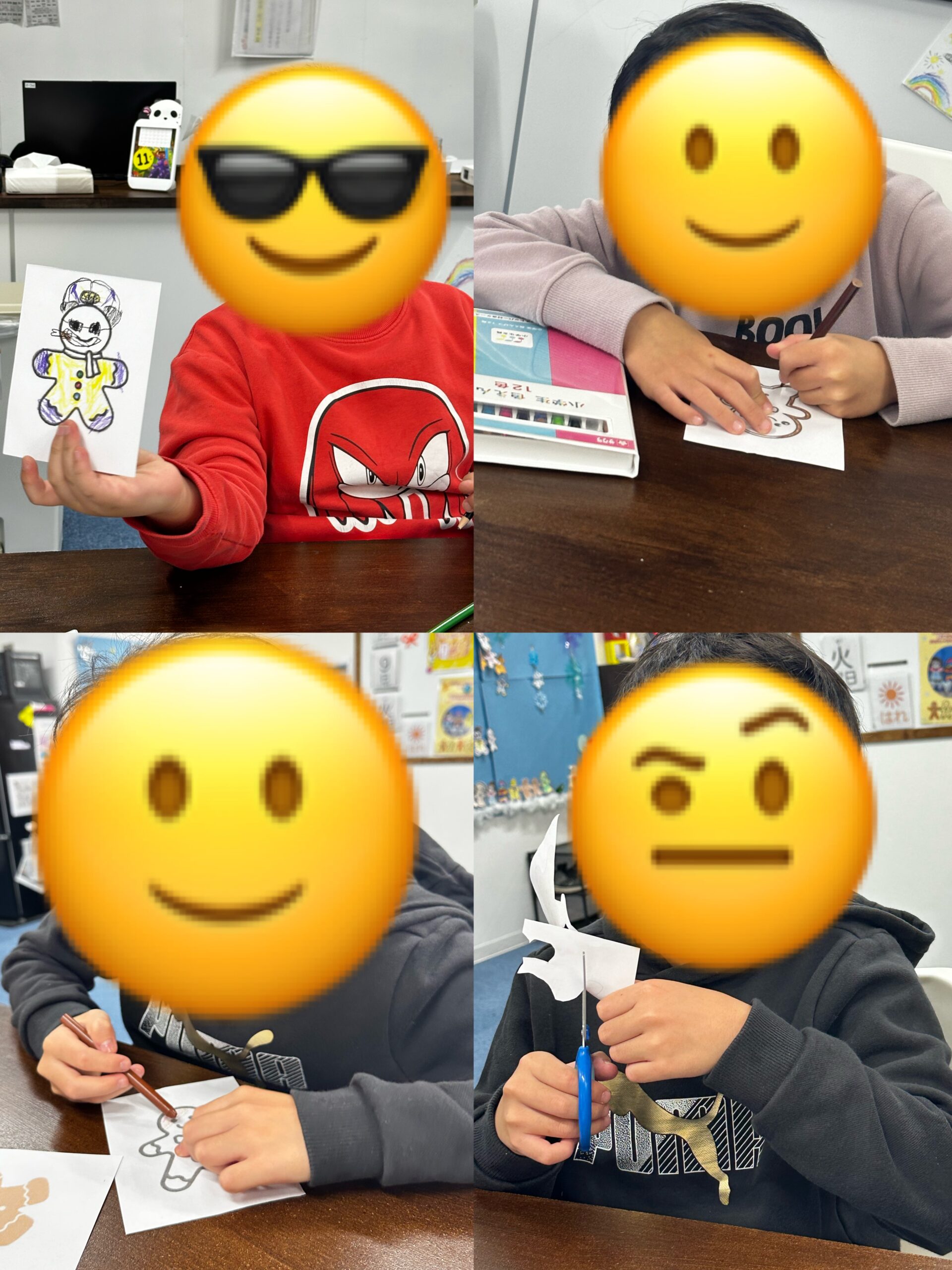 カラフルに仕上げるお子さんや、ホラー系のゲームが好きなお子さんは目が充血した少し怖い雰囲気のデザインにしたり、リアルな鼻を描いてケラケラと楽しそうに笑ったりと、終始にぎやかな雰囲気の時間となりました♪