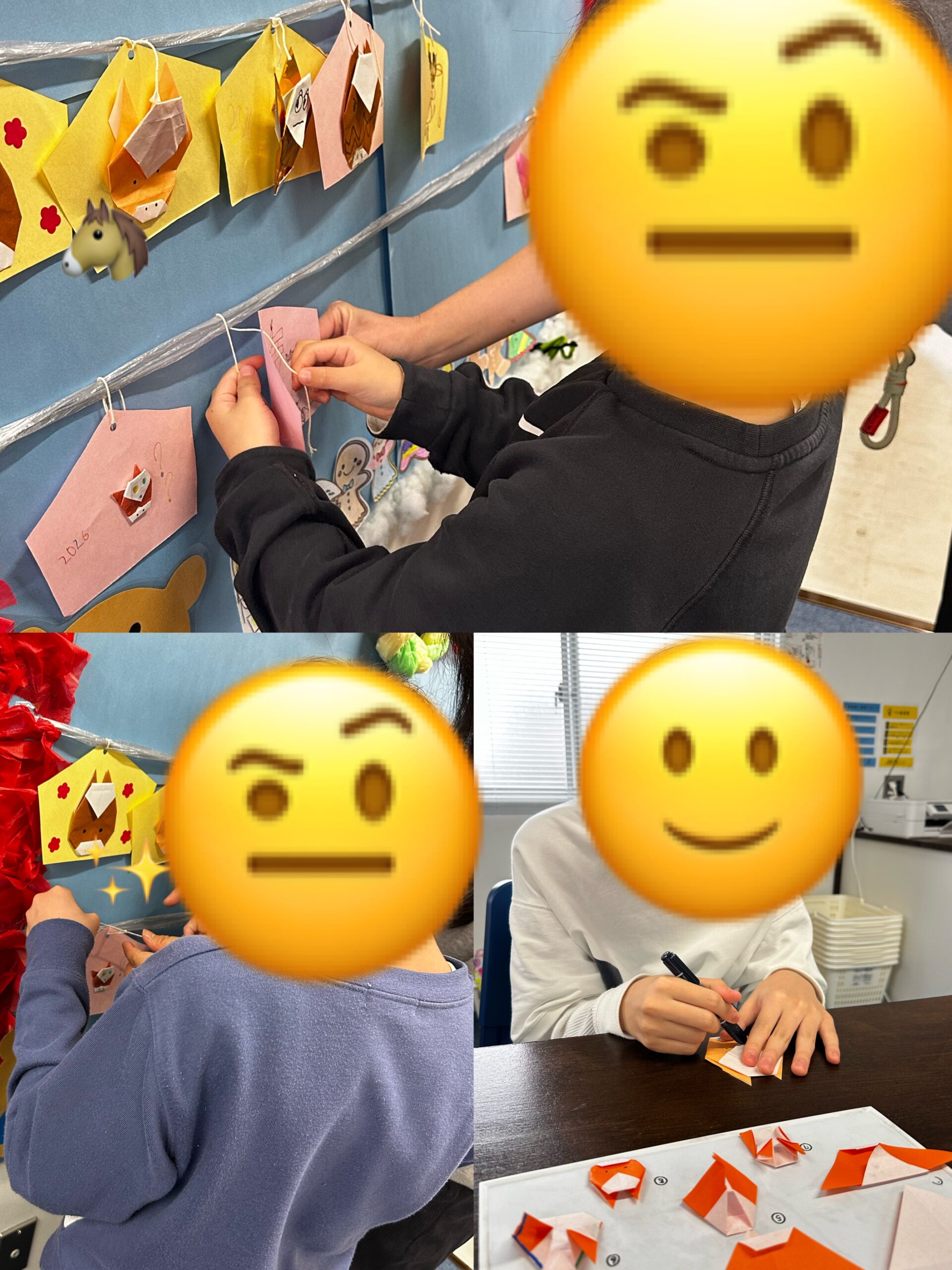折り紙で今年の干支である「馬」を折り、絵馬を作ろうと声を掛けると、「何色にしようかな~?」「ピンクにしようっと!」と、子どもたちは茶色だけでなく、ピンクや緑、赤など、それぞれ好きな色の折り紙を選んでいました。